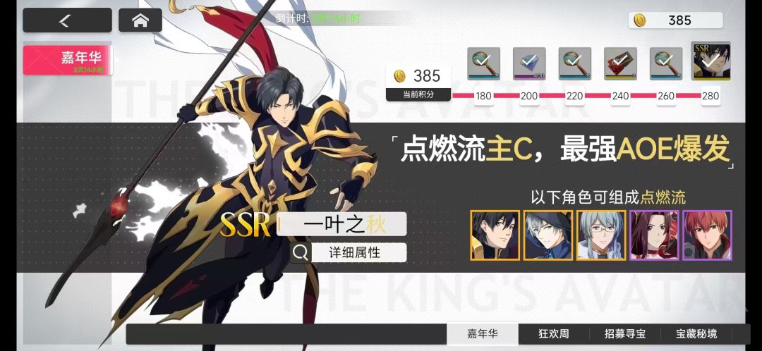 阵容体系:这一套阵容一寸灰是必须要有的,不然一叶之秋/叶修直接被抓去坐牢,很难搞,保证先手的同时增加队友力量、智力、暴击率。没有小手冰凉就用君莫笑。通过一寸灰拉条叠buff,王不流行的技能与队长技去叠点燃,逐烟霞的被动拉条再叠点燃,最后通过一叶知秋强龙压收尾。喜欢纯输出就用浅笑迷人弥补第一个回合结束后点燃缺失。,喜欢有容错就用小手微凉复活一叶知秋。要注意一点的就是,小心人家君莫笑、包子入侵致盲一叶知秋/叶修,不然的话中招了就是白给。缺点就是容易被针对。