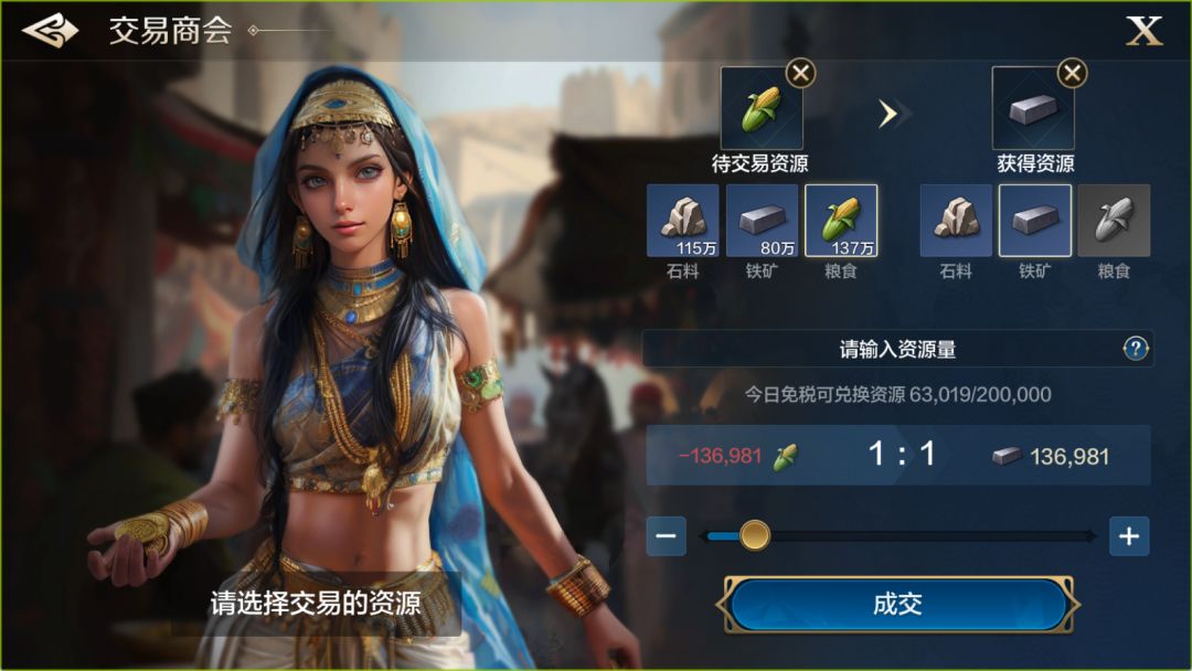 当然,在主城建筑都升满级、战斗紧张阶段,可以将多余的石料换成铁矿以及粮食。