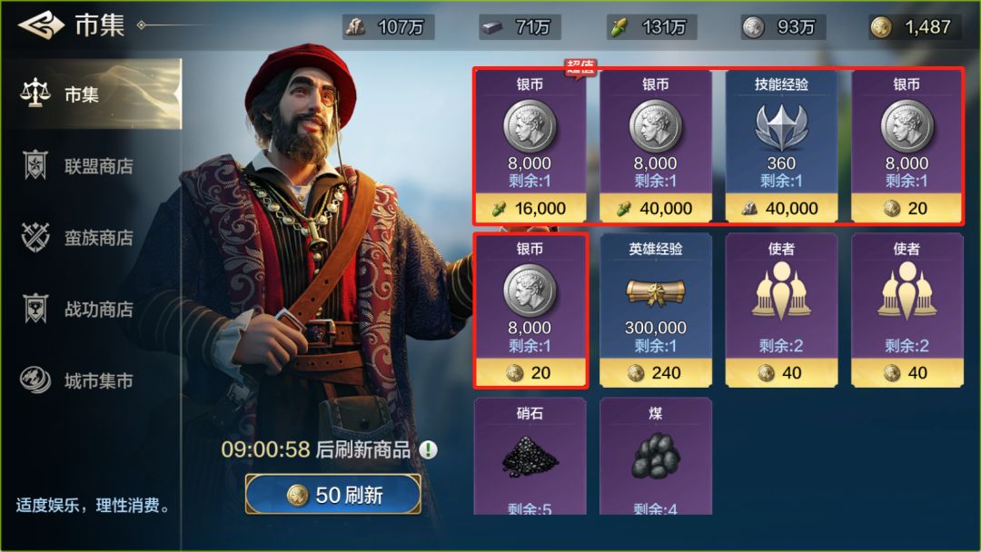 ①市集:推荐购买银币用于抽拆料卡,此时城市外交和兵种全都解锁完毕了,不再囤积使者以及硝石、煤等战略资源,这些已经不再缺少的资源按需购买。