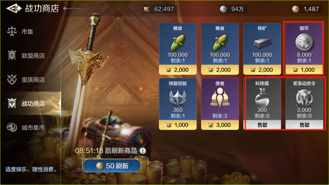④战功商店:必买银币、科技值与紧急动员令
