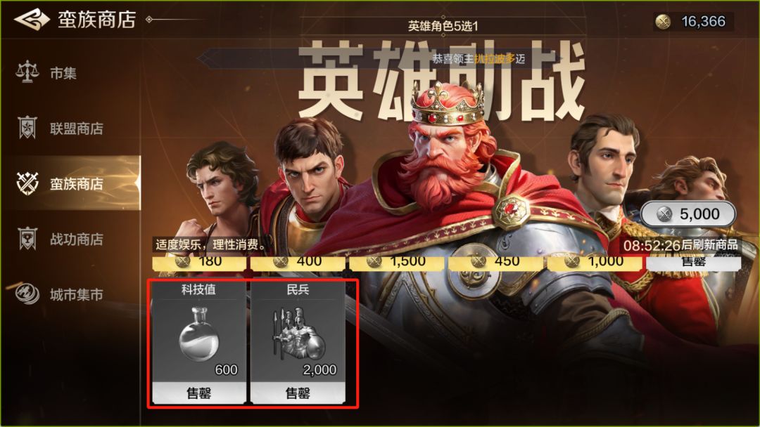 ③蛮族商店:同样是必买科技值、民兵,如果资源充足也可以购买紧急动员令,缓解战场巨大的造兵压力。