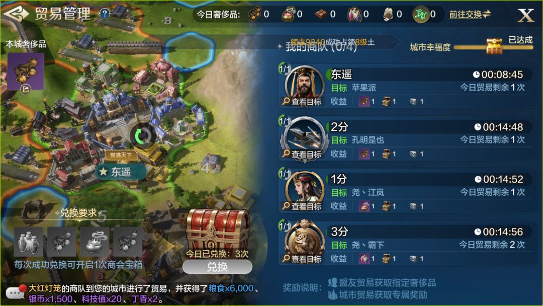 贸易管理:在开完三分城之后每天可以贸易非常多次,兑换的宝箱奖励丰厚,同时还有概率出现五星英雄刘备,并且累计贸易次数还能增加城市幸福度,满10次之后就能开一次宝箱获得各种资源。