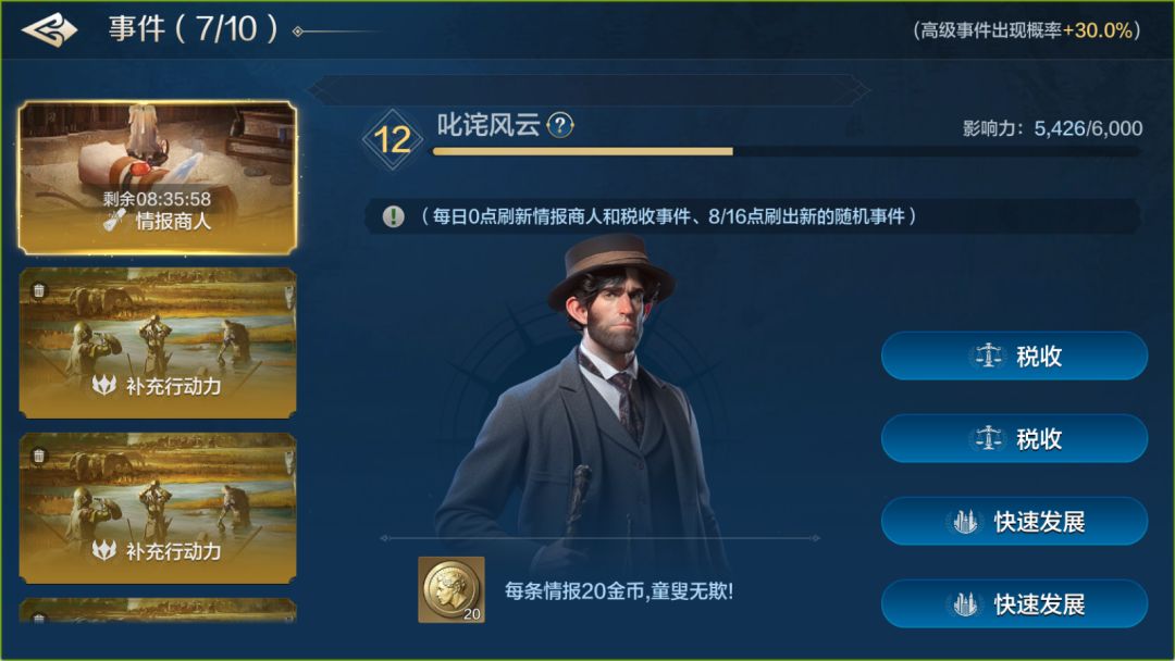 事件推进:每日的事件都会带来各式各样的资源补充,并且会固定刷新一个情报商人,税收、快速发展或者其他选择按需购买。同时随着事件完成得越来越多,世界影响力等级也会相应提高,而高等级的世界影响力可以使得每日刷新的事件质量更高,奖励更加丰厚。