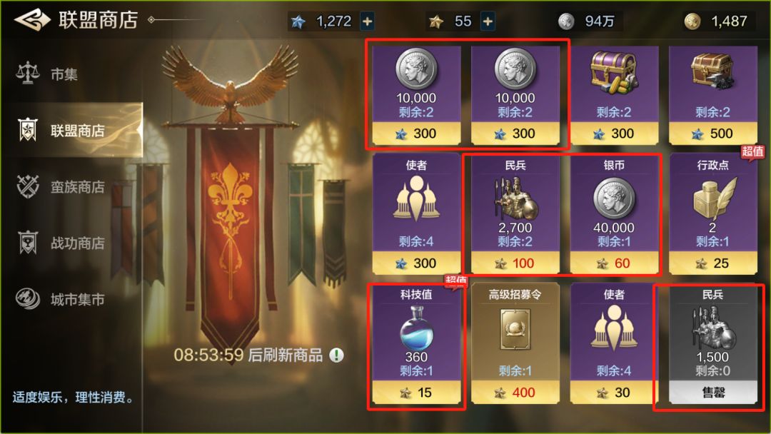 ②联盟商店:推荐购买民兵用于补充作战需求,同时必买银币野科技值,其他的按需购买。