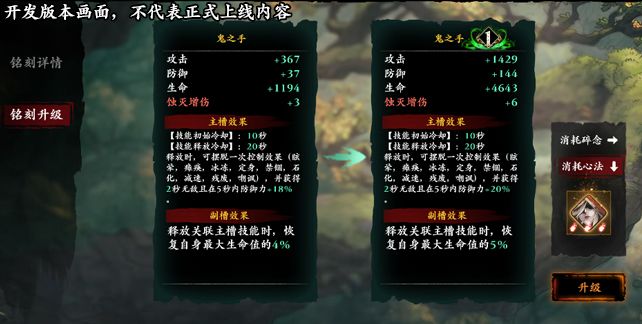 在图鉴中点击铭刻可进行升级,铭刻升级将会提升铭刻带来的属性加成将得到提升,不同品质的铭刻提供的属性加成均有不同。铭刻升级将消耗相应的红3心法或指定数量的相应心法碎念,每张铭刻最大等级为3级。