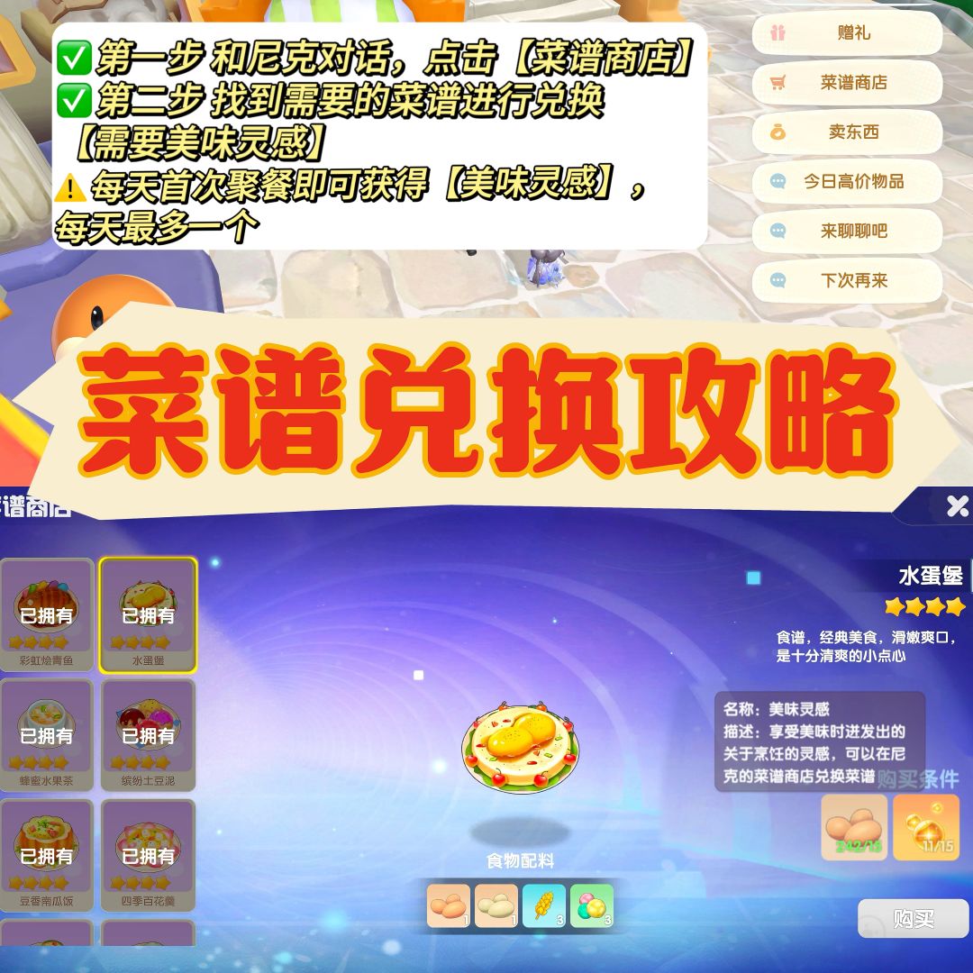 和尼克对话,点击【菜谱商店】,兑换需要的菜谱,菜谱兑换需要【美味灵感】,每天首次聚餐获得, 每天最多一个