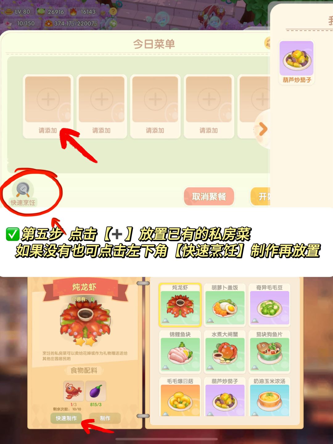 ⚠️如果没有私房菜可点击左下角【快速烹饪】获取