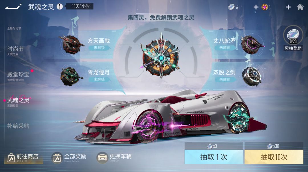 武魂之灵武魂之灵系列轮毂8月9日集结登场!集齐四款武魂毂更可解锁超级大奖—武魂之灵轮毂。『武魂之灵 轮毂』:乱世出英雄,群雄竞逐鹿。装备后,四款武魂轮毂会依次显示在车辆轮毂的四个位置,参与比赛时,四条不同的漂移拖尾绝对可以让车手在比赛中熠熠生辉!『青龙偃月 轮毂』:乱世出英雄,武魂燃九霄!青龙偃月刀一出,横扫八方无敌手!『丈八蛇矛 轮毂』:乱世出英雄,武魂燃九霄!丈八蛇矛在握,敌皆无敢近!『双股之剑 轮毂』:乱世出英雄,武魂燃九霄!双股之剑,利可断金!『方天画戟 轮毂』:乱世出英雄,武魂燃九霄!方天画戟在手,谁敢与我一战!