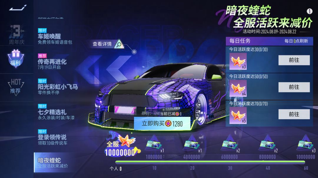 暗夜蝰蛇『全服活跃来减价』8月9日~8月22日,完成每日任务可以获得活跃星星道具,1个活跃星星道具可以贡献1点全服进度。全服进度到达指定目标后可以为全新涂装-暗夜蝰蛇减价!快喊上好友一起来减价吧!