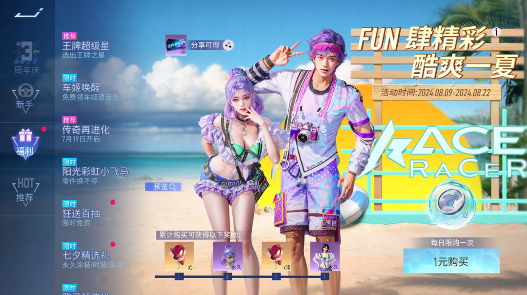 酷爽一夏这个夏天,酷爽一夏。8月9日~8月22日,车手们每日都可花费一元购买超值奖励,立即获得2个外观币,累计购买还可以获得浪漫玫瑰,“夏日心情”时装等。
