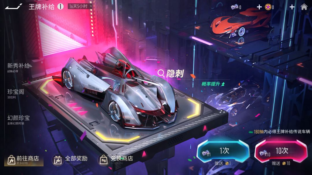 王牌补给-隐刺8月9日起,王牌补给将开启全新活动!传说车辆『隐刺』限时概率提升66%!『全新大招-隐秘地刺』加速推进,极速提升30km/h,持续7秒。开启大招时在身后铺设持续存在50秒的地刺。『SP技能-地刺回收』回收场上所有自身铺设的地刺,每回收一个获得25%大招能量。『被动特性-秘密计划』开局时获得3500集气量,首次使用氮气时在前面80米处铺设地刺,对局中每次成为敌方锁定类技能目标时有45%概率闪避。