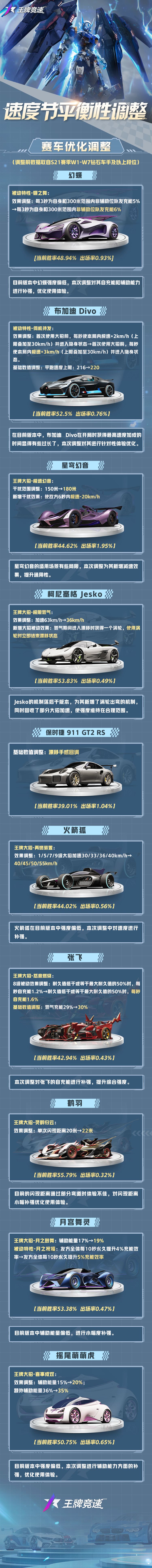 平衡性调整为了维护车辆平衡性生态,带来更好的竞速体验,本次更新带来了部分车辆的平衡性调整。您可以在游戏内或点击下图查看调整详情。