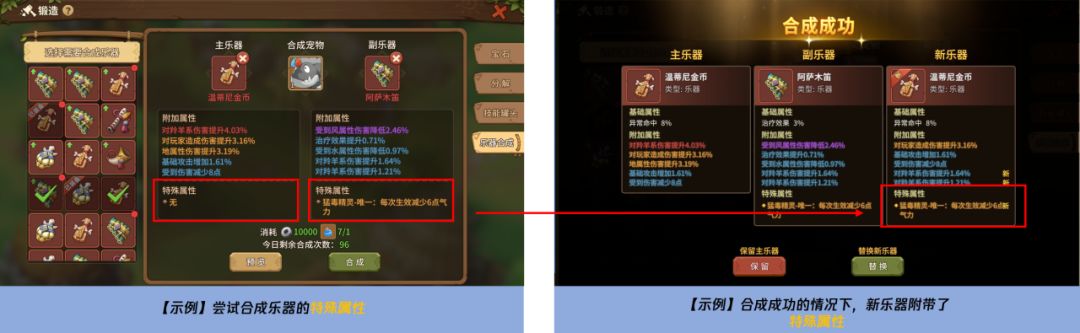 ① 合成时可优先追求和当前乐器类型更合适的特殊属性。举个例子,阿萨木笛的【特殊属性】-猛毒精灵更适合温蒂尼金币使用,因此温蒂尼金币作为【主乐器】,阿萨木笛作为【副乐器】进行合成,合成成功的新乐器拥有了【特殊属性】-猛毒精灵。