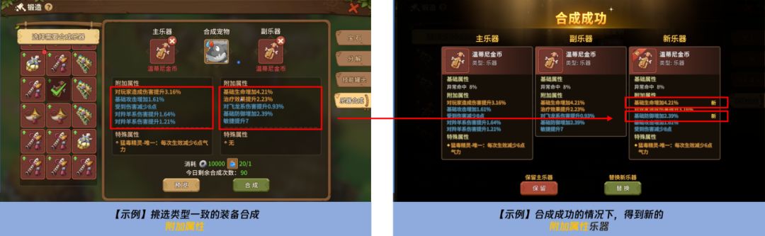 ② 挑选类型一致的装备,将期望的附加属性合进新的乐器。举个例子,温蒂尼金币已有合适的【特殊属性】,但【附加属性】还有提升空间,因此选择有不错【附加属性】的同类型乐器进行合成,尝试合成后的新乐器拥有更好的【附加属性】。