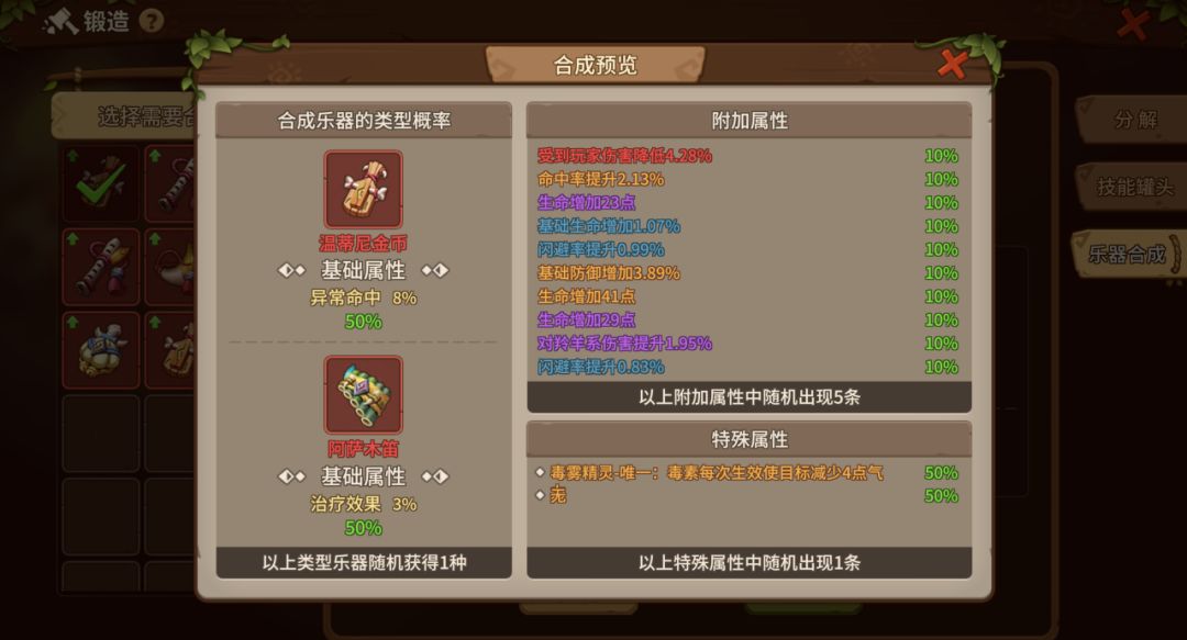 ※合成乐器时,各项参数和概率,均可通过【合成预览】界面进行参考。有效利用【合成预览】能更快合出理想乐器哦!