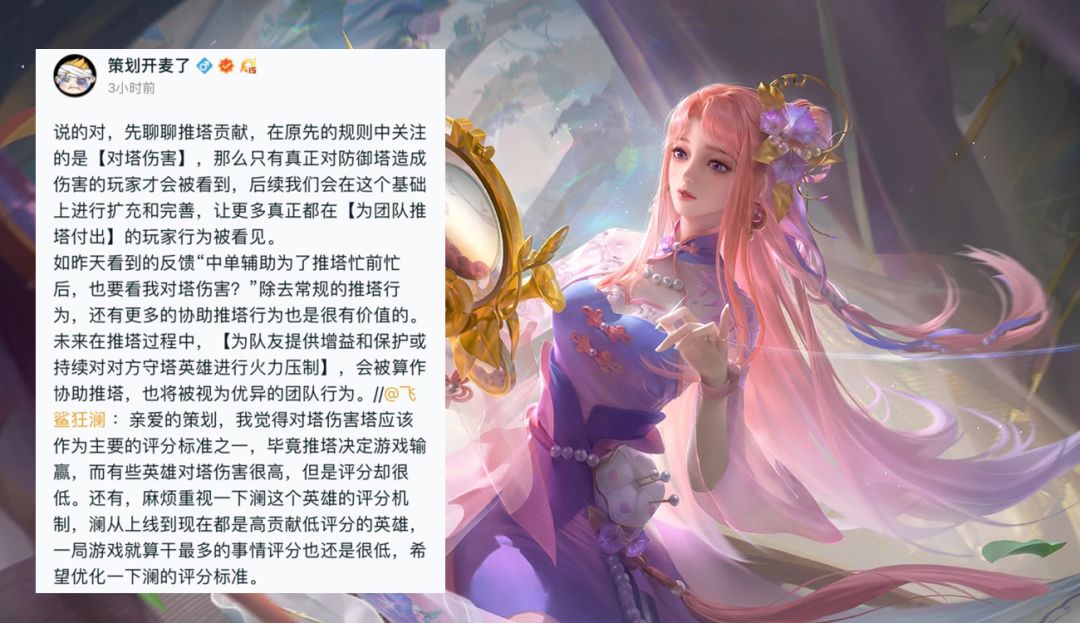 所以优化推塔评分机制势在必行,官方给出的优化方案是在原有的基础上进行扩展,把为队友提供增益、保护、持续对敌方守塔英雄进行火力压制也视为推塔行为。