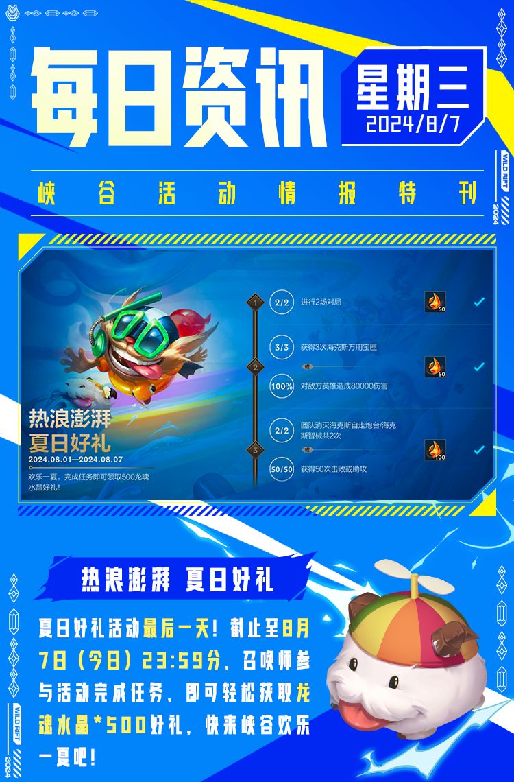 截止至8月31日23:59分,召唤师记得在每天登录游戏后,前往峡谷日历签到领好礼噢~活动期间内,日历签到最多可获得龙魂水晶*2600、蓝色晶石*300及魄罗币*130;累计签到达到指定天数,还可获取深渊之骰(3天)、心花怒放、团魂卡、皮肤姿态甄选宝箱及史诗皮肤限时体验自选奖励!