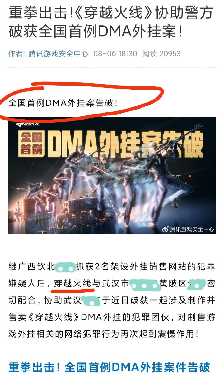 8/6号下午,“腾讯游戏安全中心”发布公告称,腾讯旗下游戏《穿越火线》协助破获了首例 DMA 外挂案件❗❗❗