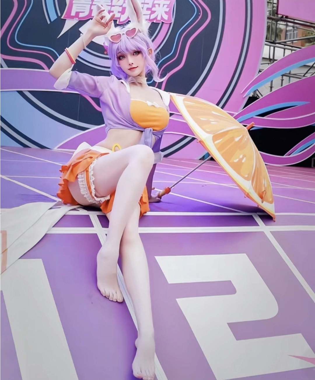 能看到,走路摇戴着一头紫色的头发,头上还戴着白色的毛绒兔耳朵,眼睛里面戴着蓝色的美瞳,妆容也化的非常的精致,特别的好看。穿着也非常的夏日风,完美还原公孙离的穿着。能看到她穿着橘色的小短裙,上身是一个比基尼,不过外面也是穿了外套的。身材特别的好,腿又长又白,并且小腹还没有赘肉,简直就是完美女神。而且她的锁骨,估计很多女孩子都羡慕吧,看着好有味道。