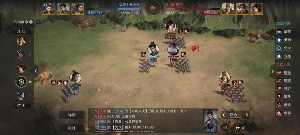 最终的战报显示,周瑜全场发动了27次临机制胜,是贡献输出最猛的单个战法。不过客观来说,决定战斗成败的主要因素,还是贾诩的诡道玄机和5次之多的巧利天灾。正是因为贾诩的活跃表现,使得对面9级地守军利的黄忠和关平都陷入了半瘫痪状态。除了混乱就是技穷,再猛的武将也会在这样的压制下逐渐迷失的。