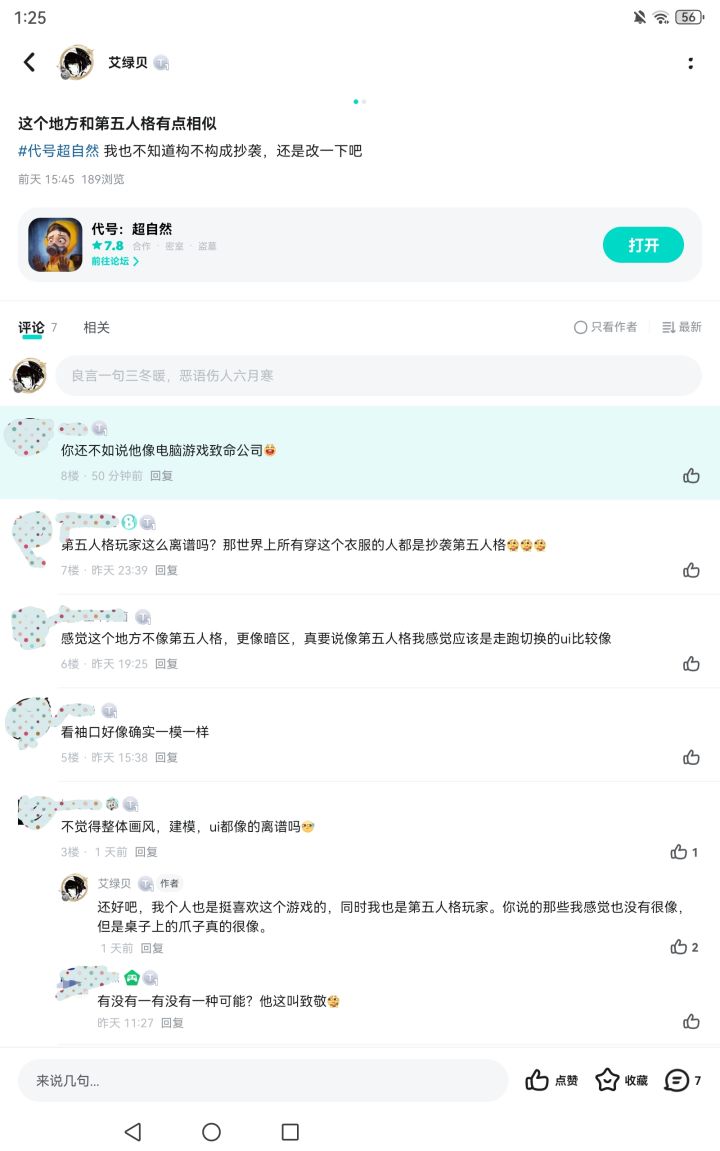 首先我是一名第五人格玩家,其次我个人也很喜欢这款游戏,然后我是说这两张桌子上的手相似,希望改一下。因为我不知道什么程度才构成抄袭并且我怕直接说抄袭会引来大家的不满,所以才说“不知道构不构成抄袭”,因为两款游戏我都很喜欢,不希望有冲突,所以我说“还是改一下吧”并且我投的是意见箱。两双手的相似程度也是有的,袖口真的很像,整体就像把手的位置改一下,颜色换一下。代号超自然里面的照片,我经过了提亮。最后我想说还是改一下吧。