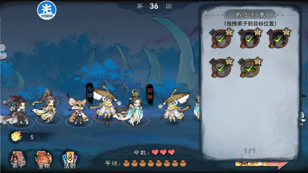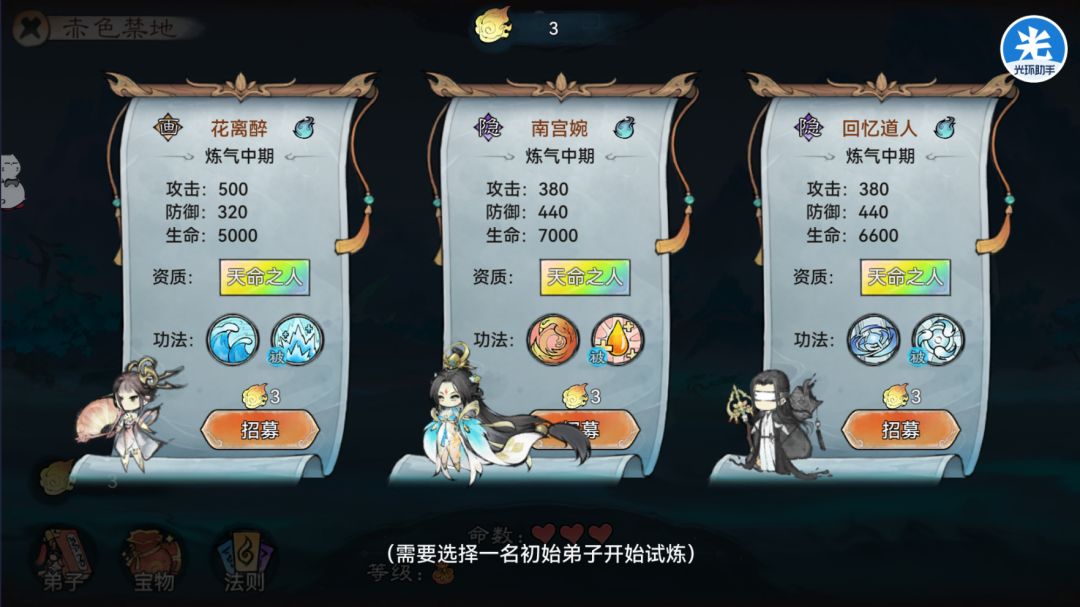 试炼开局随机三名弟子,如有南宫婉、影千手、韩立则必选,否则随意选择一名开始游戏。弟子招募消耗3点机缘值,逐出返还2点,刷新消耗1点。同一弟子重复招募可提升等级,最高升到红色三星。