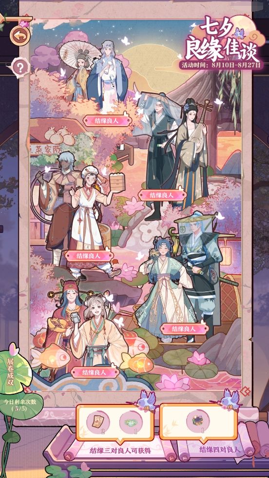 掌柜可任选喜爱的角色,逐步完成结缘任务,解锁七夕主题小剧场,获取丰富道具奖励~