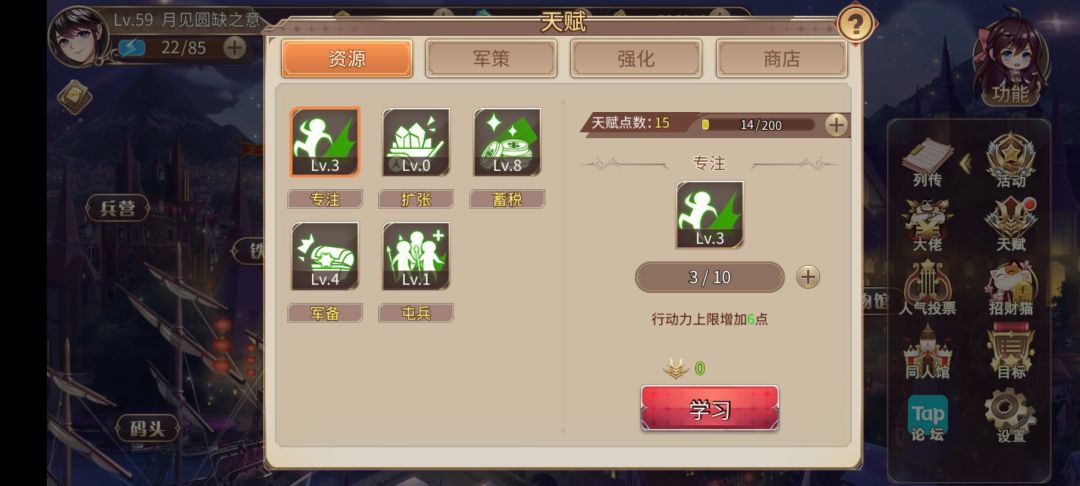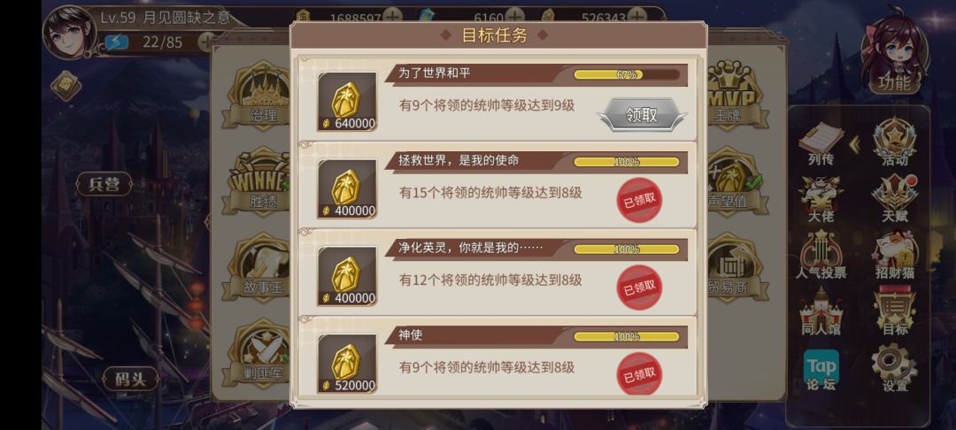 先说说现在新人的角色和资源分配方面,正篇中后期的资源方面概括起来就是:缺,非常的缺。用我的情况来说,现在主城59级,总共用了半年时间,从董卓到通关正篇用时两个月。