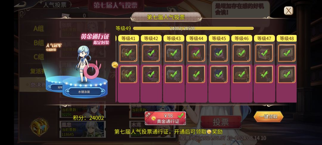 时装购买了孔明维多利亚、兵长运动服、船长泳装、观羽水龙袍,剩下4万钻石都用于日常提升练度了,平均每日除用掉月卡和遗迹获得的钻石,还额外花费200钻(当然由于多年之前快退坑的时候胡乱浪费了不少资源,偶尔上线无脑操练所有战姬,熔炼宝石,钻石的实际利用率不高,一部分是拿去补当时瞎弄的坑了)。即便如此,8级蓄税,加上51活动满级奖励和现在的人气投票的奖励,金币依然很缺,有时候都直接大佬商城钻石买金币材料。声望方面更加没有余力顾及,过董卓后刷了半个多月20体声望本,到现在通关正篇也只有六个角色有9级统帅。