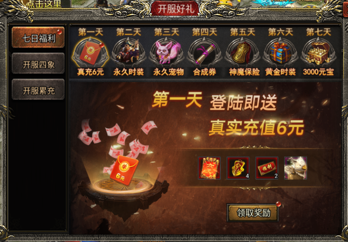 第四天:初级合成券*5,特权令*4,神魔结晶*20,称号开服勇士*1