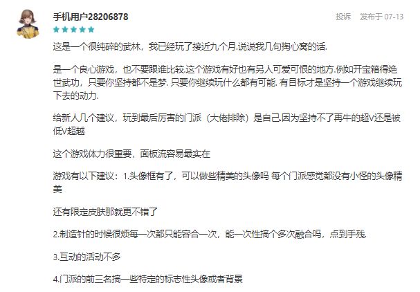 除此以外还希望可以收到成长建议,可以是大侠们所希望的新门派(具体的门派名,名望,派系,属性,故事等),新武学,新武器,新玩法等,或是针对目前游戏版本内容的优化建议等,大侠们可以在周年庆这样欢快的气氛下畅所欲言哟~