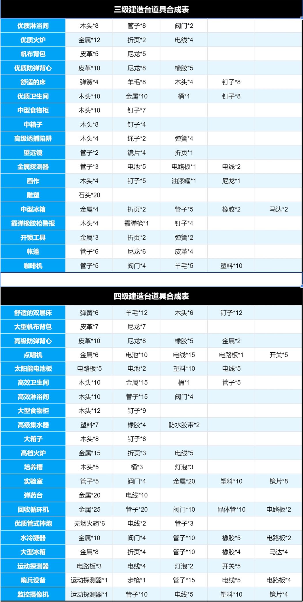 《庇护所》工具台三四级合成清单攻略来了,作为在游戏中后期的关键道具,合成将消耗我们更多的资源。