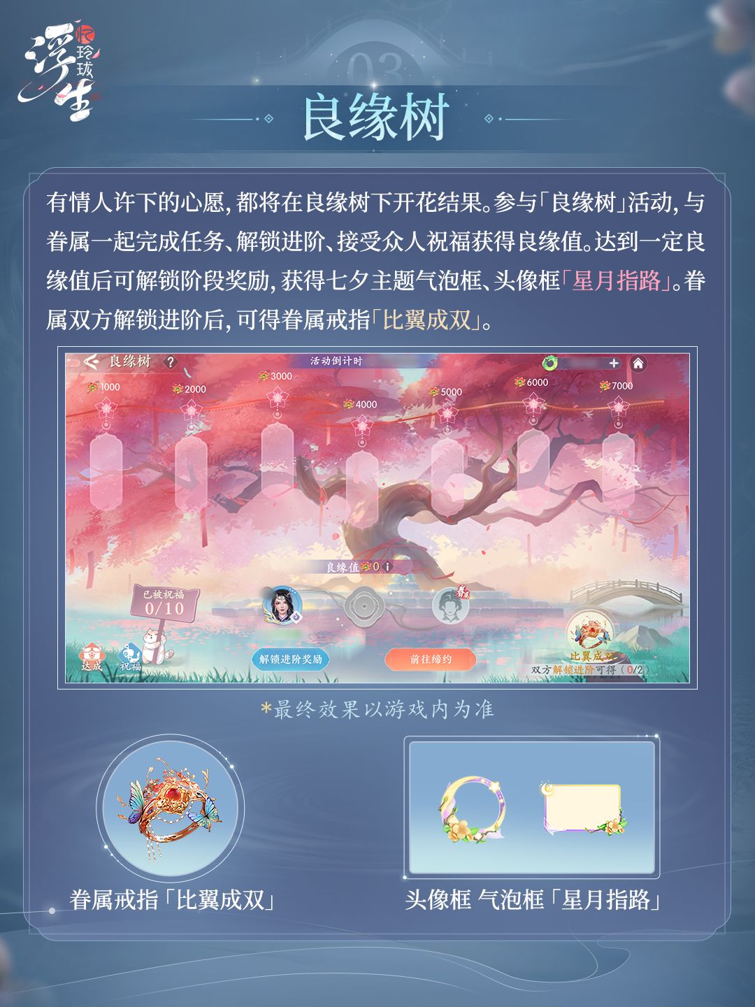 · 良缘树:与眷属共同完成任务、解锁进阶、接受众人祝福获得良缘值。达到一定良缘值后可解锁阶段奖励,获得七夕主题气泡框、头像框「星月指路」。眷属双方解锁进阶后,可得眷属戒指「比翼成双」。