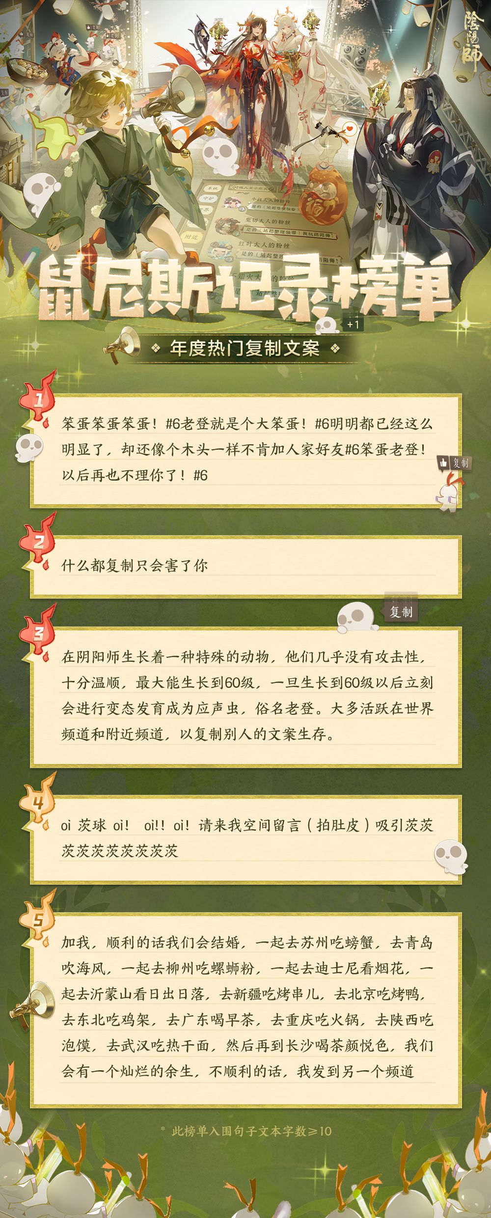鼠尼斯记录榜单新鲜出炉,快看看里面是否有大人复制过的文案吧~在这热火朝天的应声虫节,让我们高举手中的世界频道,一起复制!粘贴!
