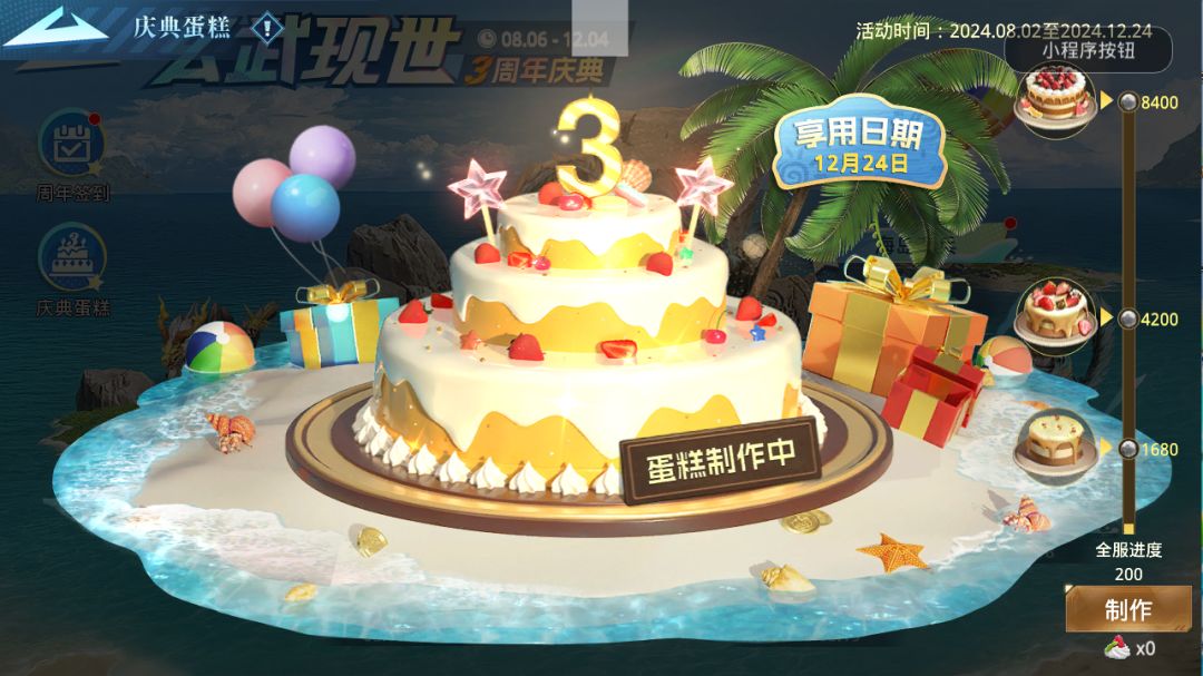 通过游戏内活跃玩法可获得奶油道具,捐献可提升全服制作进度,蛋糕制作完成之后,全服玩家均可领取对应的进度宝箱奖励。