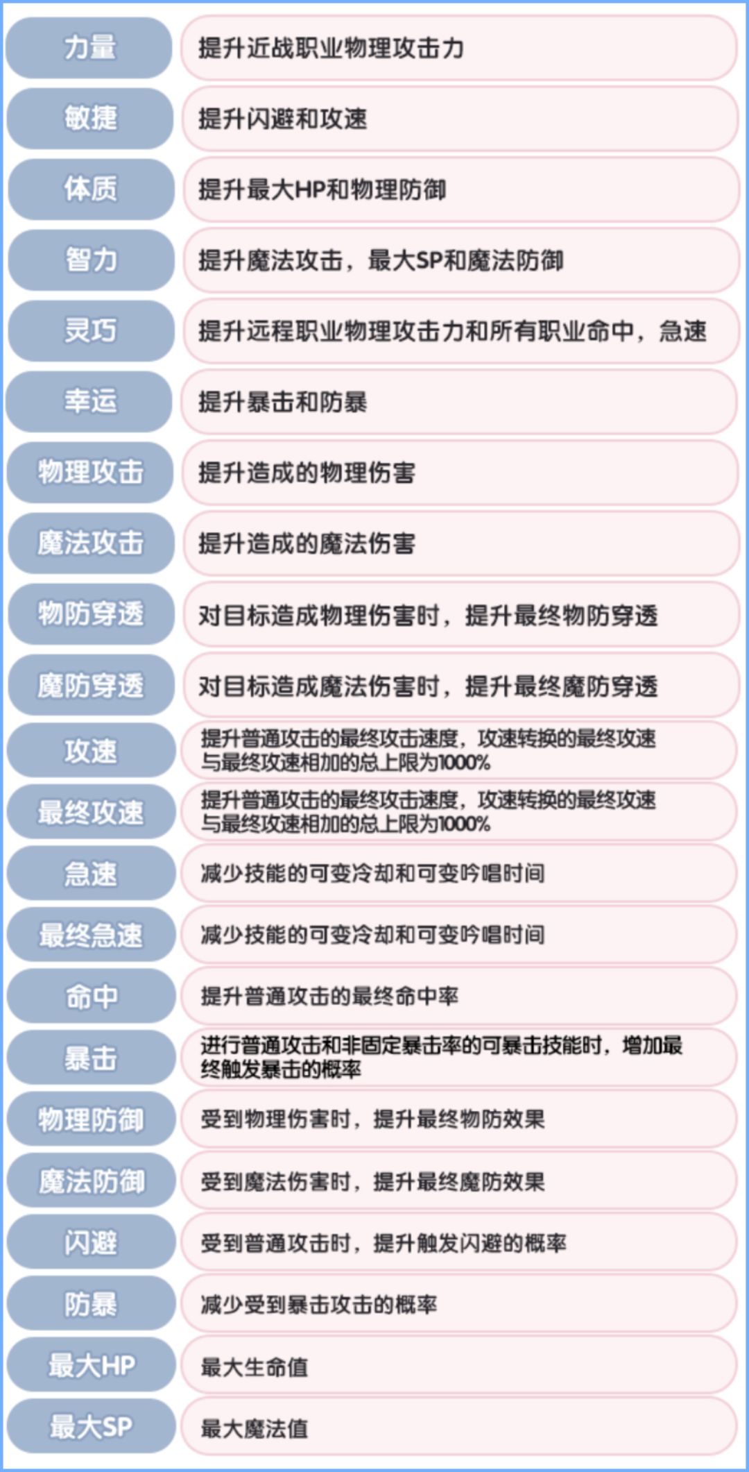 基础属性在游戏中可以通过人物加点或者穿戴装备等方式获得,提供的效果较为基础,属于部分职业可通用的属性。