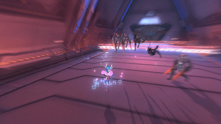 但如何在技能设计中展现“电音”和“电玩”元素呢?我们想过做音波攻击,但打击感总是不太理想,而且也没法很好地展现魔灵“玩耍”的状态。后来我们从音游中受到启发,结合了近几年比较流行的“音频可视化”技术,尝试用音频柱状立方体来做技能特效,竟取得了意想不到的效果~