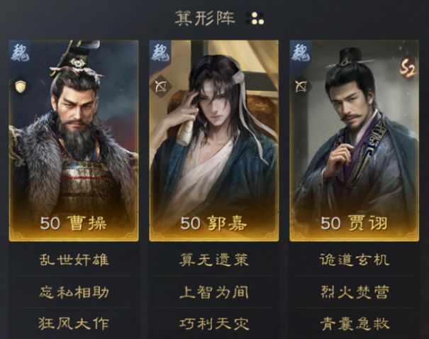 通过【狂风大作】【烈火焚营】给予对方不同的异常状态,配合郭嘉携带技能【巧利天灾】打出非凡的控制效果,同时贾诩的战法对友军造成的伤害降低60%,让【巧利天灾】伤害敌方的同时减少对我方的影响!配合曹操优秀的减伤机制,使队伍控制、伤害和续航拉满。