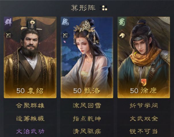 袁绍每个回合行动时使我军武力/智力/先攻最高单体分别对敌军武力/智力/先攻最低单体造成75%兵刃和谋略伤害,与此同时甄洛携带技能【指点乾坤】,提升队伍整体的输出能力,搭配徐庶较高三维的加持下在S1赛季中有着不俗的表现!