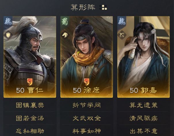 曹仁,偶数回合有75%概率技穷敌方两人,搭配徐庶的【折节学问】、【料事如神】的技穷效果,非常克制以主动战法进行输出的队伍,尤其针对三宝,桃园等阵容,郭嘉携带【清风驱疾】可以有效保证队伍续航,出其不意地进行收割!由此形成高控制高伤害的队伍!