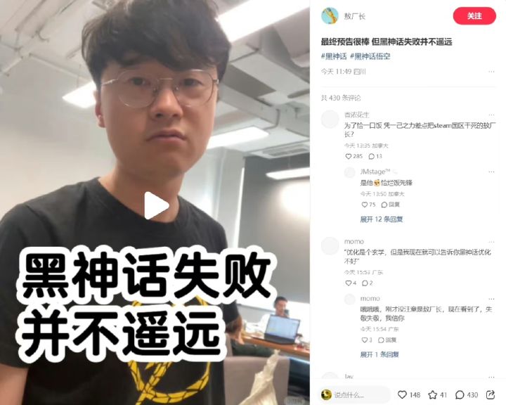 8/8号,敖厂长在《黑神话 悟空》公开最终预告片后,发视频称:“预告很棒,但黑神话失败并不遥远”