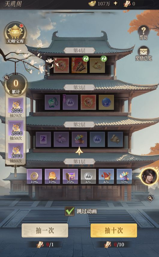 1、天玑阁少侠们可使用五雷符在天玑阁中抽奖,从所处楼层随机获得奖励。完成抽奖后,所处楼层有概率上升1层或降至第1层。玩家获得的天师玉玦可在天师宝库中兑换珍稀奖励。累计抽奖达到指定次数,可领取相应累计次数奖励。