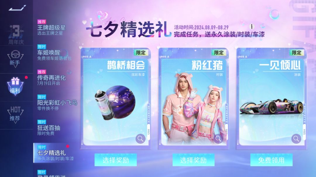 【七夕精选礼】8月9日~8月29日七夕精选好礼来啦。三款礼物粉红猪时装、以太-一见倾心涂装、鹊桥相会炫彩车漆,完成任务积攒精选礼积分可以永久获取哦!快来参与活动将三份奖品都带回家吧。