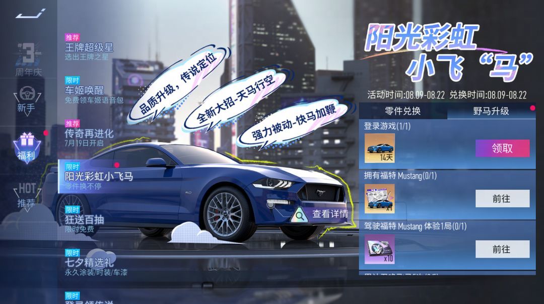 【野马升级】『阳光彩虹小飞马』8月9日~8月22日,登录即可获得『福特 Mustang』限时体验卡,让全体车手第一时间体验到天马行空的乐趣。
