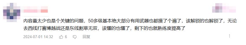 第二个原因,新鲜感下降。玩家一直在做重复的任务,失去了对任务的新鲜感,一直都是打虫子或者机器人。武器的种类也比较少,玩家在五十多级的时候差不多就能够把所有的武器解锁,导致玩家度过了一开始的蜜月期就再也提不起兴趣继续玩。