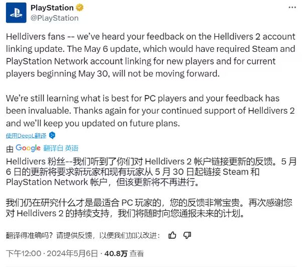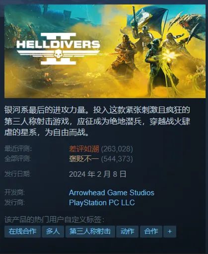 第三个原因,索尼公司的下场干扰运营,这是导致玩家集体流失的最大原因。发售之初《地狱潜兵2》凭借着纯粹的合作乐趣,较短的单局游戏时长,独特的空投支援系统,亲民的内购系统,获得了玩家的认可。但是除了初始付费后并没有比较有效的盈利手段,虽然首发成绩亮眼,但是后续运营使索尼担忧。于是索尼开始强制玩家需要绑定PSN账号才能游玩,导致该游戏在177个国家的Steam平台下架,严重侵害了PC玩家的权益,引起了玩家强烈的反感,短短两天内游戏就收到了23万条差评。