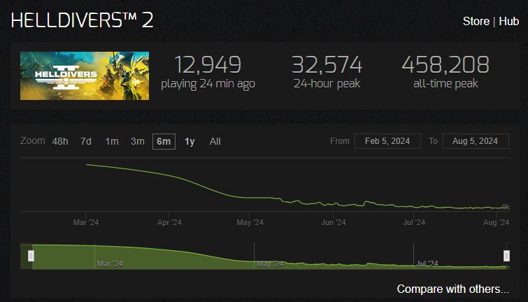 《地狱潜兵2》可以说是继《幻兽帕鲁》之后的又一现象级热门游戏了。最巅峰的时候达成了同时在线人数458709人的恐怖成绩,黑马一般冲上了Steam同时在线人数排行榜前列。但最近在线人数断崖式下跌,究竟发生了什么?