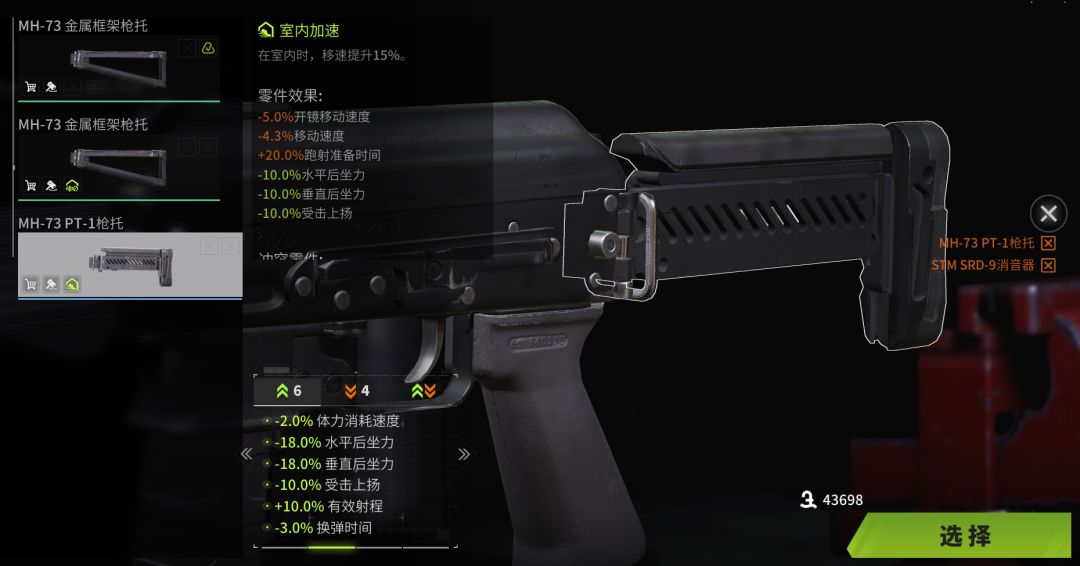 攻略团比较推荐室内机动机动性强化枪托,可以增加15%的移速,在室内转火换点有很大优势,移动声纹和射击声纹的需求可以通过静音甲和消音器来替代。主流玩法是在巴夫工厂凭借室内加速优势持续作战,如果选择室内隐蔽属性则可以节约静音甲和消音器成本,选择更强势的噪音甲。