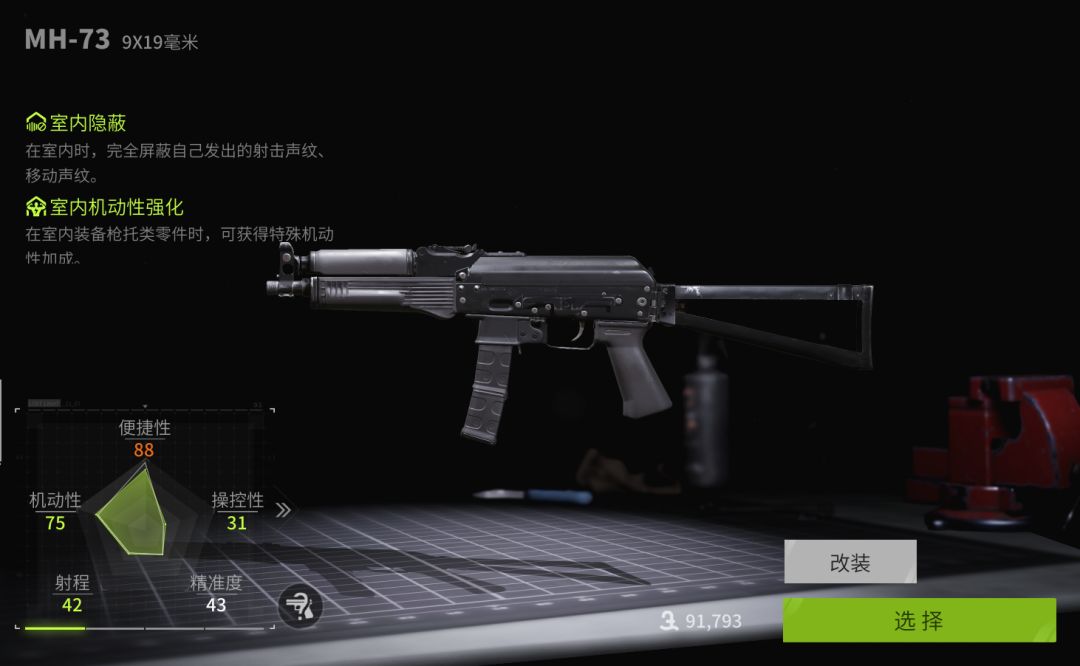 一:室内隐蔽、室内机动性强化词条定位:室内隐蔽机动作战、压制敌方实用评分:⭐⭐⭐⭐⭐娱乐评分:⭐⭐室内隐蔽和室内机动性强化是属于MH-73这把冲锋枪,使用9x19mm子弹。需要注意两种属性源自不同枪托配件,只能二选一。室内机动性强化枪托处于室内环境时增加15%移速,室内隐蔽属性的枪托相当于消音器,移动、射击均无声纹。