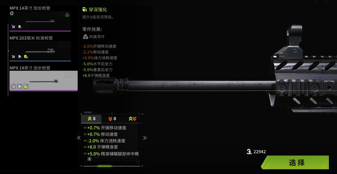 六:穿深强化词条定位:提升子弹穿甲等级、穿甲射击实用评分:⭐⭐⭐⭐⭐娱乐评分:⭐⭐穿深强化是MPX14英寸加长枪管带来的词条属性,可以增加子弹一级穿甲能力,改装也非常便宜,是降低预算的好选择,但和钝伤弹相冲突。主流玩法是使用三级普通子弹或时强化穿甲,以击穿四级护甲。
